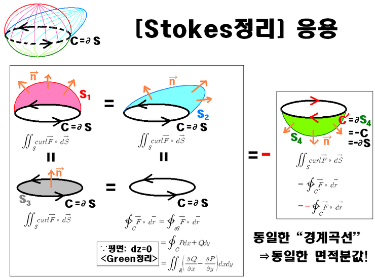 스톡스 정리는 경계곡선(폐곡선)C와 곡면S의 관계를 활용한 정리입니다.